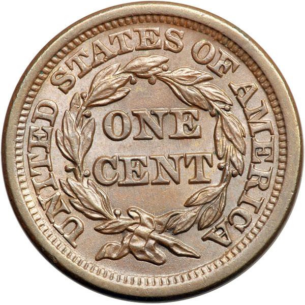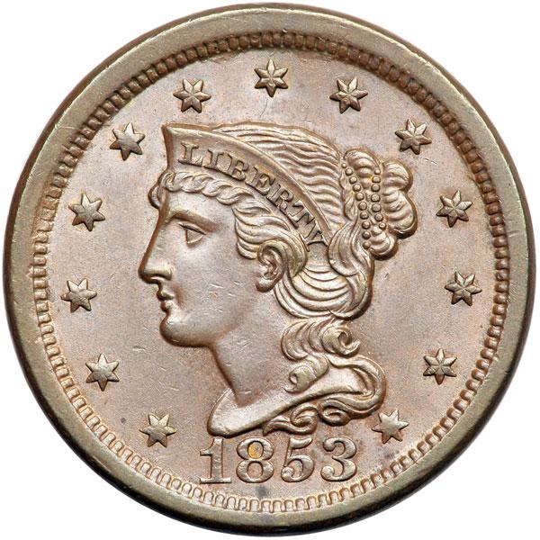 1853 N-32 R5- AU58. Frosty light to medium steel brown with hints of bluish steel overtone. The fields are satiny and very attractive, just a hint of rub on the highest points from mint state. The only defects are a spot of darker olive toning under the 8 and an even fainter one under star 13, plus a barely visible rim bruise at the F in OF. M-LDS, die state b late. The die line from the stem tip to the adjacent A is dull and barely visible. There is clear strike doubling on ONE CENT and the right side of the reverse (from die bounce). Tied for CC#3 in the Grellman census. Removed from a PCGS slab graded MS64BN (PCGS label included). DWH #2268.