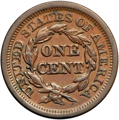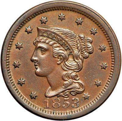 1853 N-5 R2. AU-50. Frosty medium brown with darker steel and chocolate toning on the highpoints. Choice eye appeal, nearly flawless. A microscopic pinprick near the hair right of the eye is the best identifying mark, and it is barely visible. E-MDS, die state b. The fine repunching under the 53 is gone but the die lines from the inner curl remain visible.