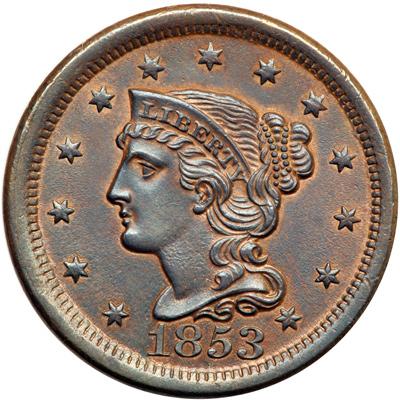 1853 N-6 R1. AU-58. Frosty dark bluish steel and olive with frosty light brown and tan toning covering the protected areas on both sides. Nearly flawless, just a hint of friction on the highest points from mint state. A light nick on the rim at star 12 and a tiny planchet flake hidden in the dentils over the left top of the U in UNITED are the only defects. MDS, die state b. The die lines from the dentils at star 2 are faint, nearly gone, and the reverse is cracked through UNITED STATES, as usual.