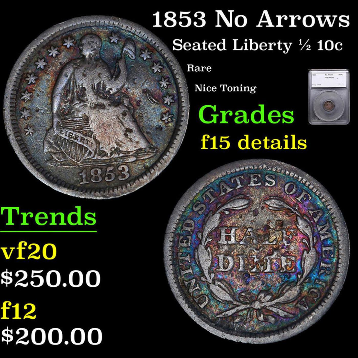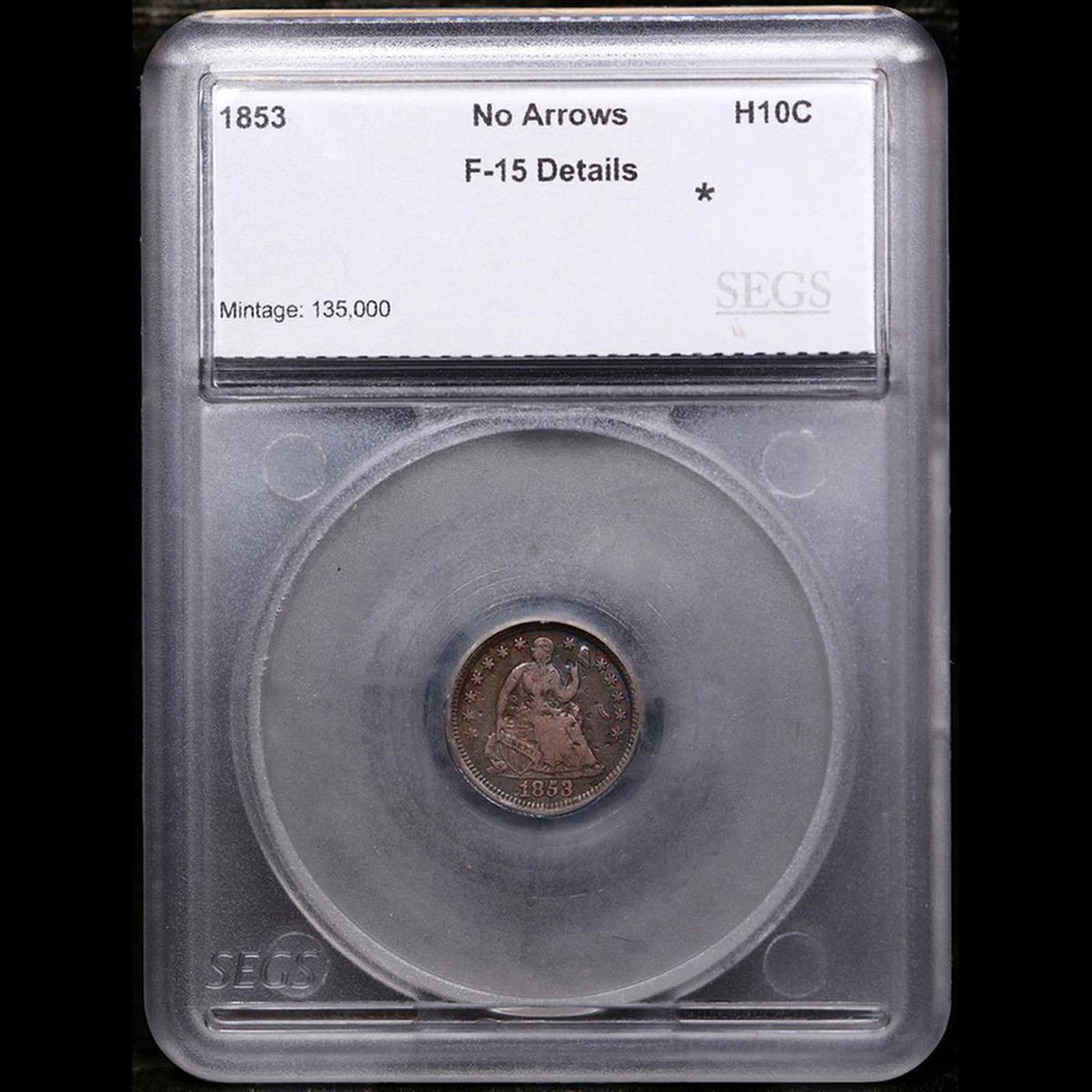 1853 No Arrows Seated Liberty Half Dime 1/2 10c Graded f15 details BY SEGS.