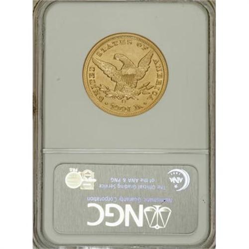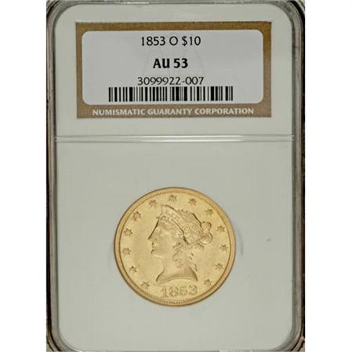 <B>1853-O $10 AU53 NGC.</B></I> Bright luster dominates the eagle and reverse margin. Luster also fills the curls and coronet. The surfaces are luminous and have only the expected marks for the grade. The 1853-O comes with and without a shield ring atop the second vertical stripe. The present piece is sans ring.<BR><BR><B>Coin Engraver:</B> Christian Gobrecht<BR><BR><b>Shipping:</b> Coins & Currency (<a target="_blank" href="http://www.heritageauctions.com/common/shipping.php">view shipping information</a>)