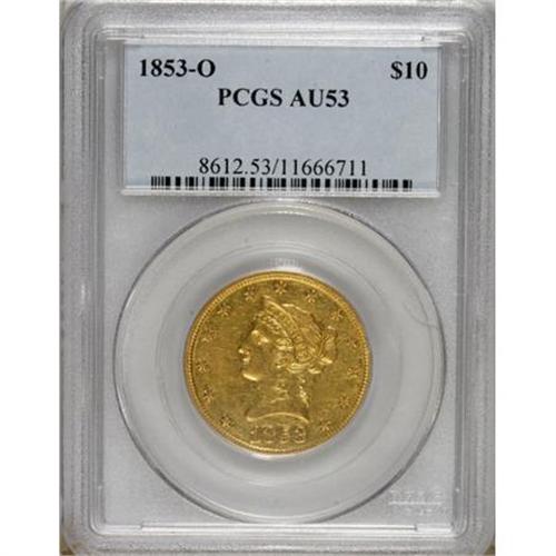 <B>1853-O $10 AU53 PCGS.</B></I> No shield ring is present atop the second stripe, as sometimes seen. The 53 in the date is lightly recut. A sharply struck piece with luminous honey-gold surfaces. Only 51,000 pieces were struck. Population: 19 in 53, 24 finer (4/07).<BR><BR><b>Shipping:</b> Coins & Currency (<a target="_blank" href="http://www.heritageauctions.com/common/shipping.php">view shipping information</a>)