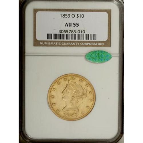 <B>1853-O $10 AU55 NGC. CAC.</B></I> Traces of luster reside in the recesses of this bright yellow-gold eagle. Nicely defined on the design elements, and no more than the normal light marks associated with a barely circulated coin. The sometimes-seen ring at the top of stripe 2 is visible on this piece.<BR><BR><B>Coin Engraver:</B> Christian Gobrecht<BR><BR><b>Shipping:</b> Coins & Currency (<a target="_blank" href="http://www.heritageauctions.com/common/shipping.php">view shipping information</a>)