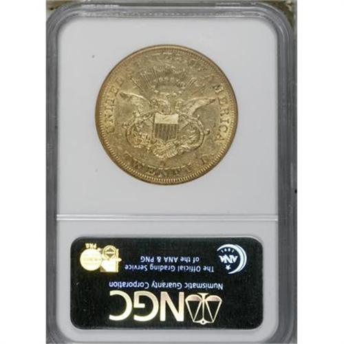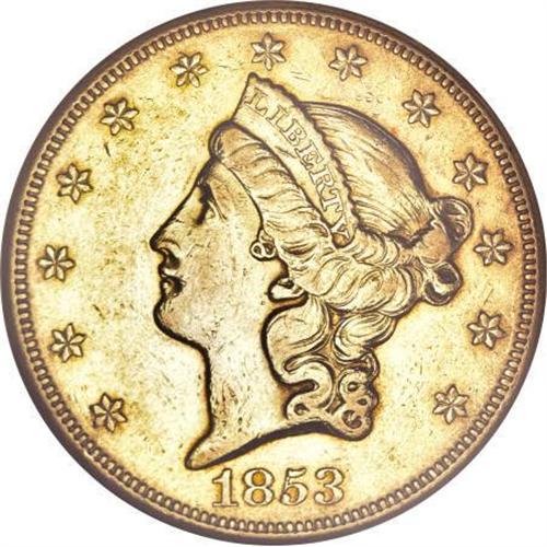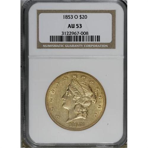 <B>1853-O $20 AU53 NGC.</B></I> Lustrous light greenish-yellow surfaces with the usual minor abrasions that are expected on these coins. Traces of wear on the highpoints are also consistent with the grade. The last of the large mintage New Orleans double eagles before the San Francisco Mint began production in 1854.<BR><BR><B>Coin Engraver:</B> James B. Longacre<BR><BR><b>Shipping:</b> Coins & Currency (<a target="_blank" href="http://www.heritageauctions.com/common/shipping.php">view shipping information</a>)