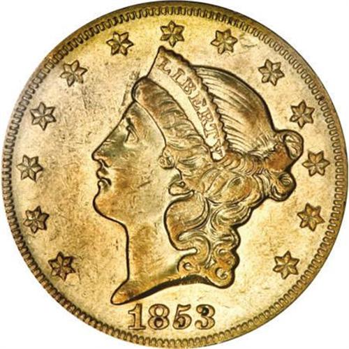 <B>1853-O $20 AU53 PCGS.</B></I> This example is highly lustrous, with appealing olive-gold surfaces unaffected by bothersome marks. At the start of the California Gold Rush, New Orleans had the closest operating mint to the action. The result was that the production of Double Eagles in 1851 and 1852 totaled nearly half a million pieces. In 1853, production in New Orleans dropped to 71,000 coins and with the opening of a mint in San Francisco, the production of New Orleans gold coinage was seriously reduced. Only 13,500 Double Eagles were produced in New Orleans between 1854 to 1856. A beautiful representative of this coveted issue. Population: 9 in 53, 35 finer (11/07).<BR><I>From The York/Hallenbeck #2 Current Finest PCGS Registry Set of Liberty Double Eagles.</B></I><BR><BR><B>Coin Engraver:</B> James B. Longacre<BR><BR><b>Shipping:</b> Coins & Currency (<a target="_blank" href="http://www.heritageauctions.com/common/shipping.php">view shipping information</a>)