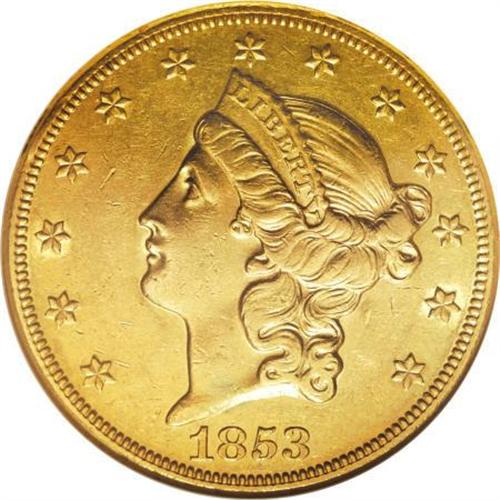 <B>1853-O $20 AU55 NGC.</B></I> Although quite a few pieces have been certified in various AU grades, this issue is a condition rarity with just six coins certified as Mint State. At the start of the California Gold Rush, the New Orleans Mint was the closest operating mint to California. From 1850 through 1852, New Orleans coined 646,000 double eagles, representing 625,000 ounces of pure gold. Today, with gold at $660 per ounce, that is over 400 million dollars worth of gold.<BR> In 1853, with higher production of private gold coinage in California, the New Orleans mintage dropped to 71,000 coins, and in 1854, when the San Francisco Mint opened, New Orleans gold coinage almost disappeared entirely, as only 13,000 double eagles were coined from 1854 to 1856.<BR> This piece is a splendid Choice AU coin with nearly full green-gold luster, accented by subliminal rose toning. The appearance is familiar to those who are cognizant of California gold pieces. Census: 38 in 55, 38 finer (8/07).<BR><BR><B>Coin Engraver:</B> James B. Longacre<BR><BR><b>Shipping:</b> Coins & Currency (<a target="_blank" href="http://www.heritageauctions.com/common/shipping.php">view shipping information</a>)