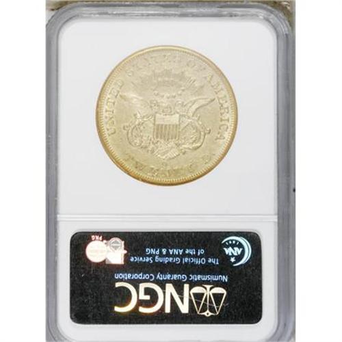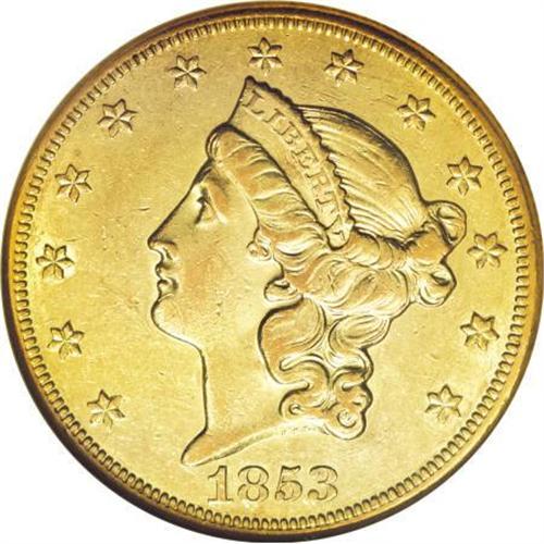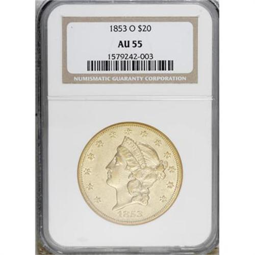 <B>1853-O $20 AU55 NGC.</B></I> Peach-gold in color, with deeper orange visible over some of the higher points of the design, this is an attractive, lightly circulated coin that still readily betrays glimpses of original mint luster. The 1853-O, while by no means common, is a coin that should be given careful consideration by any collector wishing to acquire a New Orleans mint example from this popular denomination's first decade.<BR><BR><B>Coin Engraver:</B> James B. Longacre<BR><BR><b>Shipping:</b> Coins & Currency (<a target="_blank" href="http://www.heritageauctions.com/common/shipping.php">view shipping information</a>)