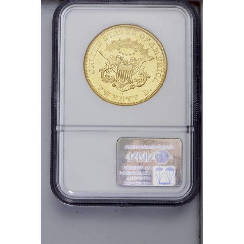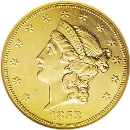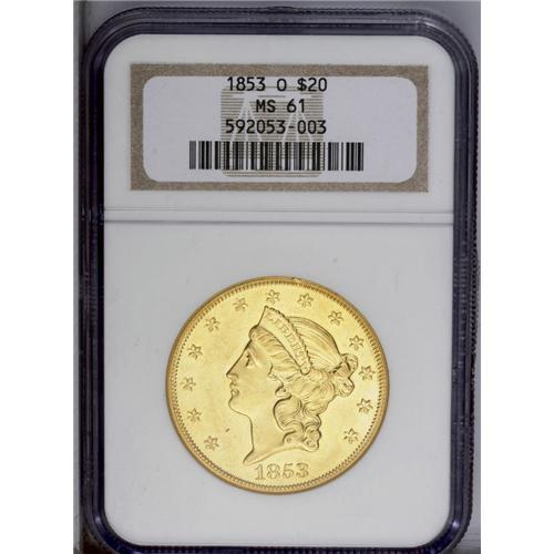 <B>1853-O<$20> MS61 NGC.</B></I> This is the first of the scarce-to-rare double eagle issues from the New Orleans Mint, although it is not nearly as elusive as certain dates that follow. The '53-O is typically found in XF to low-end AU condition, and even at those levels it is both difficult and highly sought-after. Most examples are found with serious marks, but the Mint State specimen offered here is a pleasant exception to that rule, with only a few light abrasions present on each side. The strike is well executed, including on most of Liberty's hair curls, and the original semi-prooflike sheen is intact. The specialist in this series, or in New Orleans gold coinage, may have a considerable wait before another example as fine as this one appears in a public auction. Census: 3 in 61, 1 finer (7/06).<BR><I>From The New York Eye Appeal Collection.</B></I>