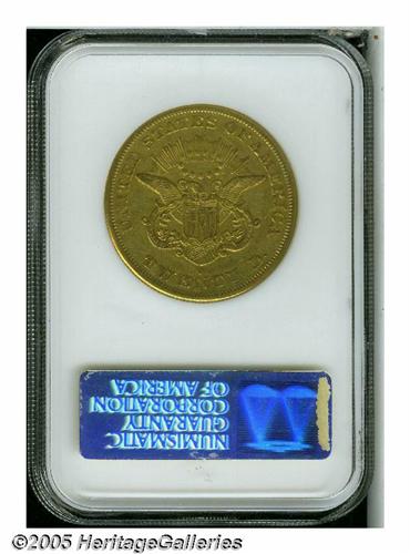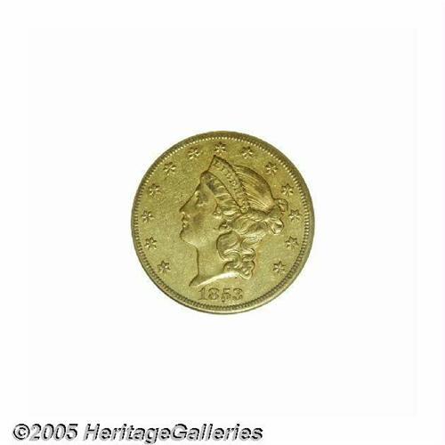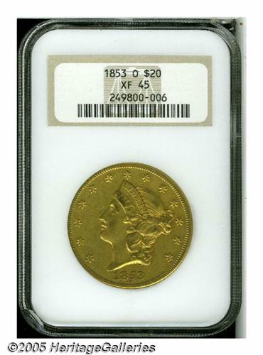 <B>1853-O<$20> XF45 NGC.</B></I> For the first time since the inception of the denomination in 1850, the New Orleans Mint produced fewer than 100,000 Double Eagles 1853. The exact number of '53-O Double Eagles produced is 71,000 pieces, survivors of which are more elusive than those of the 1850-O, 1851-O, and 1852-O deliveries. Significantly finer than the typically offered VF or XF survivor, the present example is richly colored in green-gold patina. Traces of luster are noted in some of the protected areas, and the design elements retain excellent definition. A few light abrasions are scattered over each side, none of which are individually worthy of mention. We mention that the NGC holder is chipped at the lower left (facing) obverse corner.