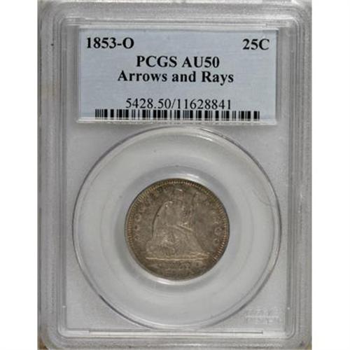 <B>1853-O 25C Arrows and Rays AU50 PCGS.</B></I> Traces of luster reside in the protected areas of this AU Arrows and Rays specimen. It possesses light golden-gray surfaces, and is generally well detailed. Quite clean for a coin that has seen some circulation. Population: 16 in 50, 27 finer (7/07).<BR><BR><B>Coin Engraver:</B> Christian Gobrecht<BR><BR><b>Shipping:</b> Coins & Currency (<a target="_blank" href="http://www.heritageauctions.com/common/shipping.php">view shipping information</a>)