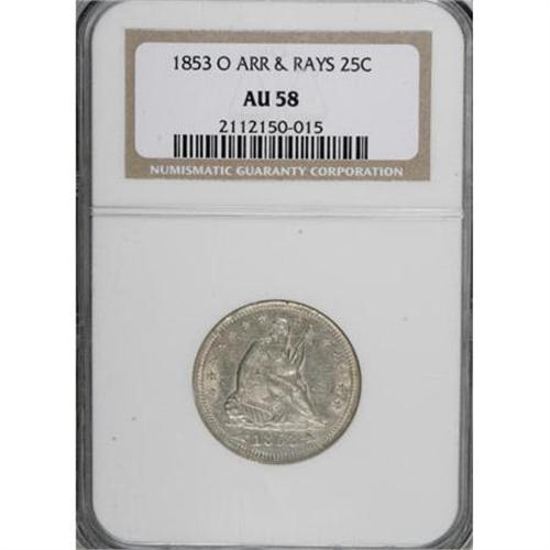 <B>1853-O 25C Arrows and Rays AU58 NGC.</B></I> A still-lustrous pearl-gray example that has minor highpoint friction and faint handling marks in the fields. Appealing overall with above-average detail. Though over 1.3 million examples were coined for this issue, few were saved, as most fueled the commerce of the bustling port city. Census: 5 in 58, 14 finer (8/07).<BR><I>From The Beau Clerc Collection.</B></I><BR><BR><B>Coin Engraver:</B> Christian Gobrecht<BR><BR><b>Shipping:</b> Coins & Currency (<a target="_blank" href="http://www.heritageauctions.com/common/shipping.php">view shipping information</a>)