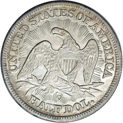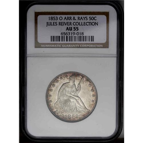 <B>1853-O<50C> Arrows and Rays AU55 NGC.</B></I> Medium russet patination encroaches upon the lightly toned centers. This bold single year type coin displays substantial luster, and only the upper right obverse field has marks detectable to the naked eye. The bullion content of Half Dimes through Half Dollars was reduced nearly 7% early in 1853 to return those denominations to circulation, and arrows and rays were added to the design to indicate which 1853-dated pieces were new tenor. The rays were dropped in 1854, but fortunately for type collectors, the 1853 and 1853-O Arrows and Rays issues are available due to plentiful productions.