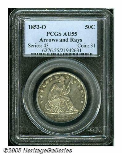 <B>1853-O<50C> Arrows and Rays AU55 PCGS.</B></I> Evenly and sharply struck with a naturally toned appearance. Despite its similar mintage, high grade O-mint examples are far scarcer than the P-mint for this one-year type.