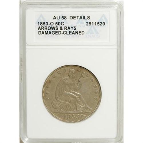 <B>1853-O 50C Arrows and Rays--Cleaned, Damaged--ANACS. AU58 Details.</B></I> NGC Census: (10/32). PCGS Population (12/29). Mintage: 1,328,000. Numismedia Wsl. Price for NGC/PCGS coin in AU58: $1,575. (#6276)<BR><BR><B>Coin Engraver:</B> Christian Gobrecht<BR><BR><b>Shipping:</b> Coins & Currency (<a target="_blank" href="http://www.heritageauctions.com/common/shipping.php">view shipping information</a>)