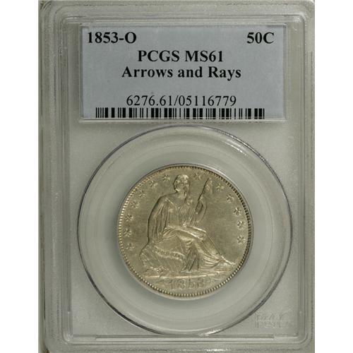 <B>1853-O 50C Arrows and Rays MS61 PCGS.</B></I> Breen-4844. No Drapery due to die polish, for what it's worth listed as "extremely rare" by Breen. The drapery is still faintly visible when viewed at an angle. Watery silver-gray surfaces reveal modest scuffiness and a bit of noticeable die clashing on the obverse.<BR><BR><b>Shipping:</b> Coin/Currency (<a target="_blank" href="http://www.heritageauctions.com/common/shipping.php">view shipping information</a>)
