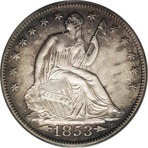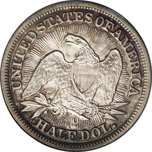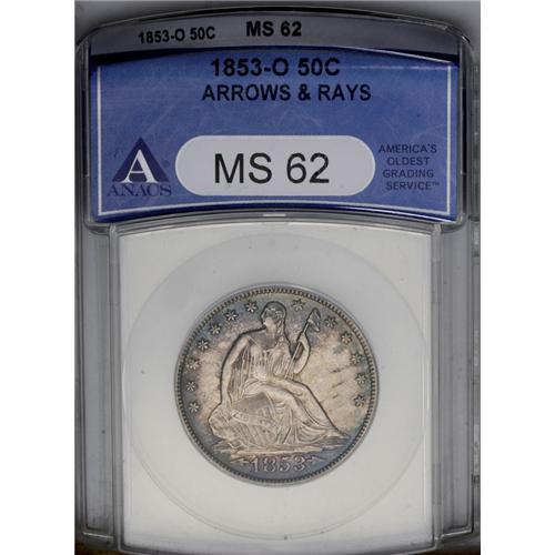 <B>1853-O<50C> Arrows and Rays MS62 ANACS.</B></I> The one-year type with a glory of rays on the reverse, issued only at the Philadelphia and New Orleans Mints. The New Orleans version of this design is much scarcer, although not substantially higher in value. This is a sharply struck and fully lustrous example with light silver surfaces and splashes of gold and steel-blue toning.