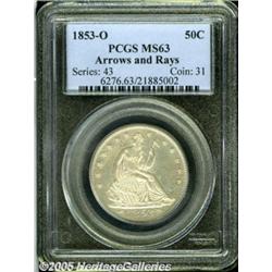 <B>1853-O 50C Arrows and Rays MS63 PCGS.</B></I> Unlike its Philadelphia counterpart, the 1853-O was not saved in large numbers by the general public and it is an especially elusive issue in mint condition. This piece is well struck in both the centers and the peripheral areas, quite unusual for this often weak issue. Mostly brilliant with some light, scattered marks to account for the grade. The surfaces impart a mildly reflective sheen indicating the dies were either new or freshly serviced prior to striking. An important, high-grade survivor of this rare issue.