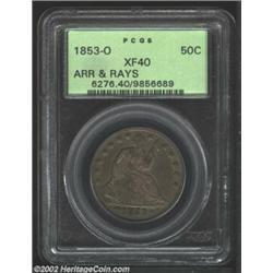 1853-O 50C Arrows and Rays XF40 PCGS. Deep lavender patina. LIBERTY is clear, with only the letter E slightly faint. Die clash lines (as struck) are noted beside Liberty's lower hand. The mintmark rests within the rays rather than in the field, which occurs only on Seated coins from this year.From the Ohio Collection. Important notice: We expect to be auctioning lots at the rate of 200-250 per hour. Sometimes eBay Premier live bid software cannot keep up with that pace, so we strongly recommend that you place a realistic proxy bid now as insurance to avoid disappointment. Also please note that all Heritage/CAA lots purchased through eBay Premier carry a 20% Buyer's Premium. Please make sure you read the Terms and Conditions.