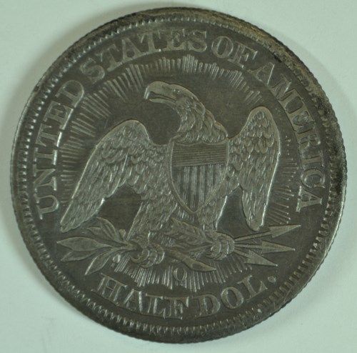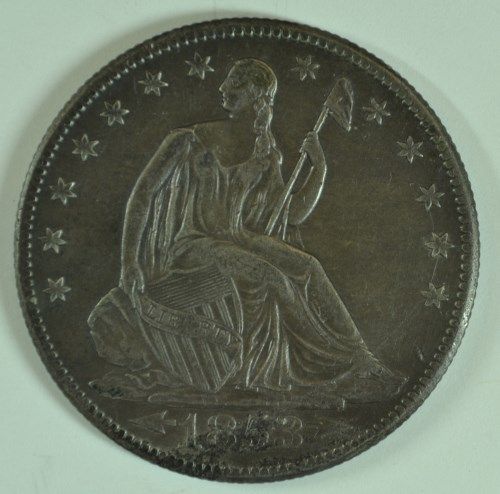 1853-O ARROWS AND RAYS HALF DOLLAR, AU-50 TONED