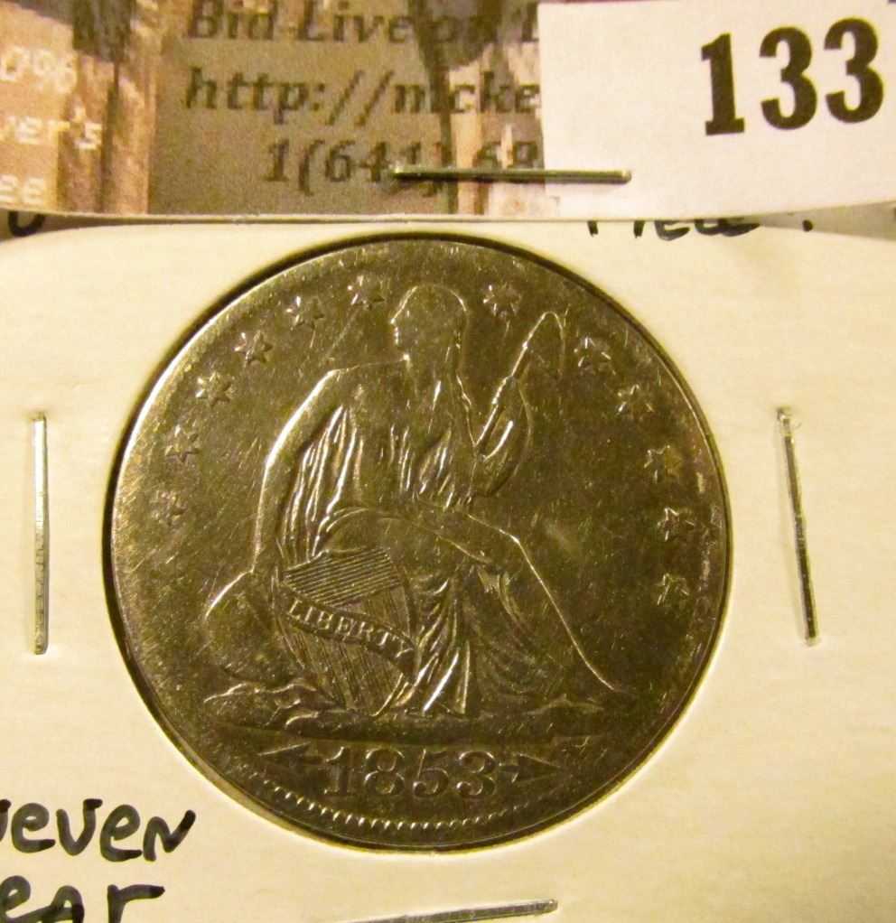 1853 O Arrows & Rays U.S. Seated Liberty Half Dollar, uneven wear, cleaned, possible pocket coin.