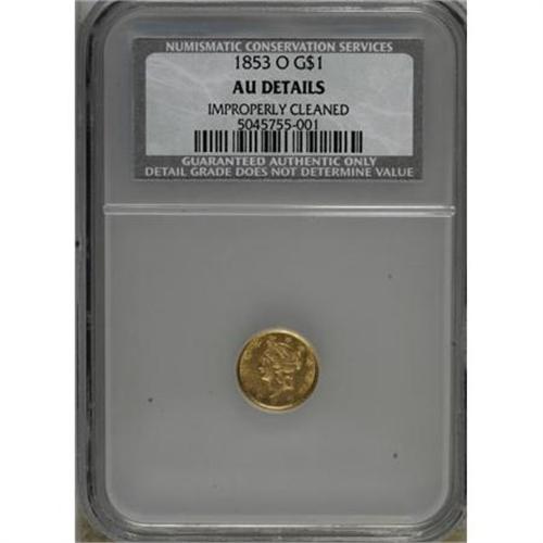 <B>1853-O G$1 --Improperly Cleaned--NCS. AU Details.</B></I> NGC Census: (16/918). PCGS Population (23/419). Mintage: 290,000. Numismedia Wsl. Price for NGC/PCGS coin in AU50: $204. (#7524)<BR><BR><B>Coin Engraver:</B> James B. Longacre<BR><BR><b>Shipping:</b> Coins & Currency (<a target="_blank" href="http://www.heritageauctions.com/common/shipping.php">view shipping information</a>)