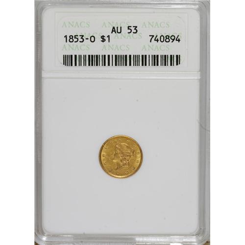 <B>1853-O G$1 AU53 ANACS.</B></I> NGC Census: (38/1660). PCGS Population (20/355). Mintage: 290,000. Numismedia Wsl. Price for NGC/PCGS coin in AU53: $217. (#7524)<BR><BR><b>Shipping:</b> Coins & Currency (<a target="_blank" href="http://www.heritageauctions.com/common/shipping.php">view shipping information</a>)