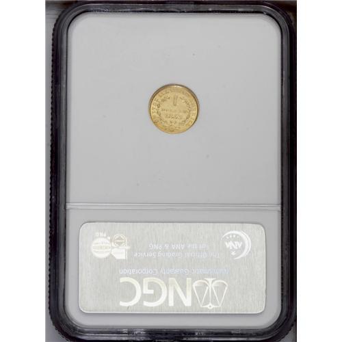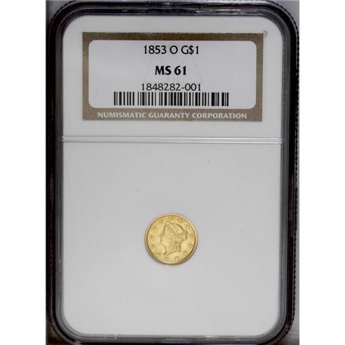 <B>1853-O<G$1> MS61 NGC.</B></I> The yellow-orange periphery lightens to straw-gold in the center. Typically struck with subtle luster and scattered marks on each side.