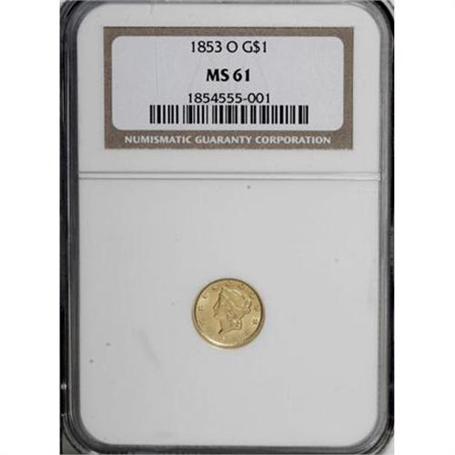 <B>1853-O G$1 MS61 NGC.</B></I> Despite a few small scrapes on the reverse that limit the grade, this is a lovely Mint State example with frosty and brilliant yellow-gold luster. It is sharply struck from a late die state with extensive flowlines.<BR><BR><b>Shipping:</b> Coins & Currency (<a target="_blank" href="http://www.heritageauctions.com/common/shipping.php">view shipping information</a>)