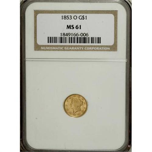 <B>1853-O G$1 MS61 NGC.</B></I> NGC Census: (193/359). PCGS Population (41/150). Mintage: 290,000. Numismedia Wsl. Price for NGC/PCGS coin in MS61: $675. (#7524)<BR><BR><B>Coin Engraver:</B> James B. Longacre<BR><BR><b>Shipping:</b> Coins & Currency (<a target="_blank" href="http://www.heritageauctions.com/common/shipping.php">view shipping information</a>)