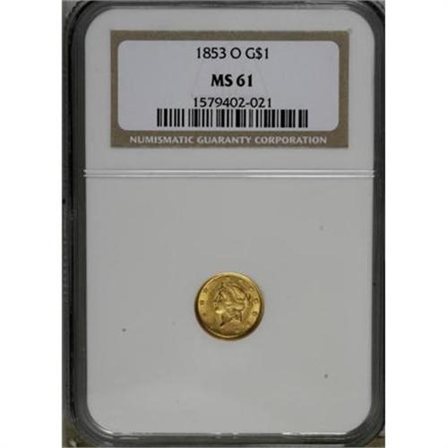 <B>1853-O G$1 MS61 NGC.</B></I> NGC Census: (216/370). PCGS Population (44/170). Mintage: 290,000. Numismedia Wsl. Price for NGC/PCGS coin in MS61: $680. (#7524)<BR><BR><B>Coin Engraver:</B> James B. Longacre<BR><BR><b>Shipping:</b> Coins & Currency (<a target="_blank" href="http://www.heritageauctions.com/common/shipping.php">view shipping information</a>)