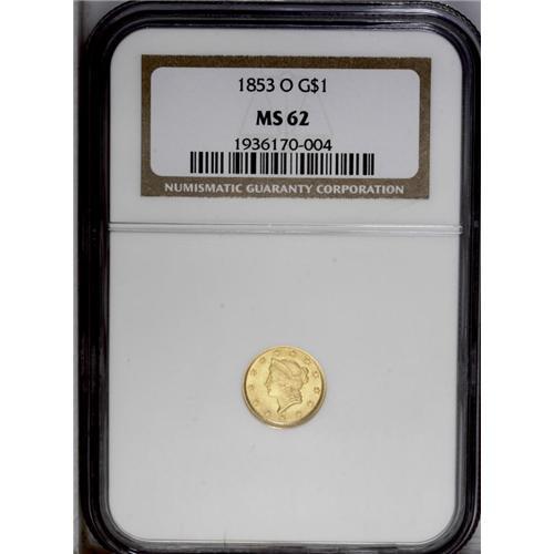 <B>1853-O<G$1> MS62 NGC.</B></I> A nicely struck and lustrous yellow-gold coin that has the initial look of a Select example, but has a few too many abrasions on closer inspection. Still, high quality for the grade.<BR><I>From The Derrick Snider Collection.</B></I>