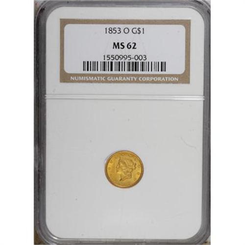 <B>1853-O G$1 MS62 NGC.</B></I> For the type collector, this is the easiest New Orleans gold dollar to obtain in any grade. A sharply detailed piece, with excellent green luster, the gold probably originating in California.<BR><BR><b>Shipping:</b> Coins & Currency (<a target="_blank" href="http://www.heritageauctions.com/common/shipping.php">view shipping information</a>)