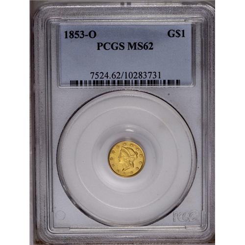 1853-O G$1 MS62 PCGS. Sharply struck design elements a 1853-O[G$1] MS62 PCGS.