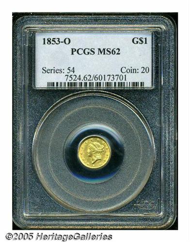 <B>1853-O<G$1> MS62 PCGS.</B></I> Sharply struck with rich yellow gold luster and only a few insignificant contact marks. This is a lovely example from the Southern Mint, an active supplier of coinage to the nation.