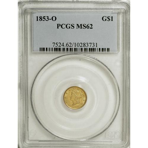 1853-O G$1 MS62 PCGS. The sharply struck design elemen