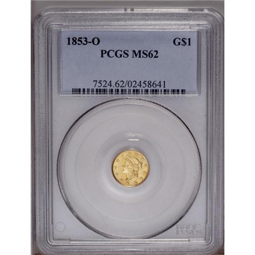 <B>1853-O G$1 MS62 PCGS.</B></I> Well struck with good luster and rich orange-gold patina. Only lightly abraded for the grade with one mentionable mark in the reverse field. O-mint Gold dollars are always much scarcer than their Philadelphia Mint counterparts.