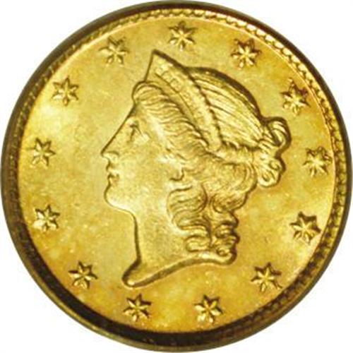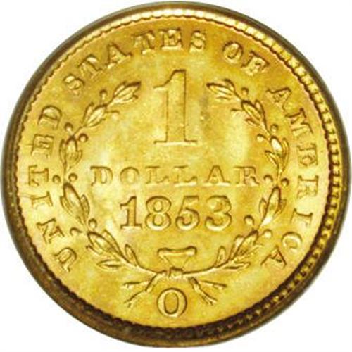 <B>1853-O<G$1> MS63 PCGS.</B></I> Attractive reddish and olive tinged surfaces are satiny in texture and well defined for this most obtainable O-mint Gold Dollar. While found without too much difficulty in Mint State, Select and better examples are far more challenging and are scooped up quickly by Southern gold collectors.