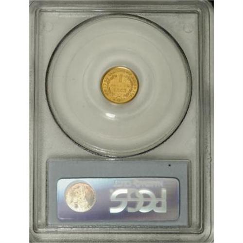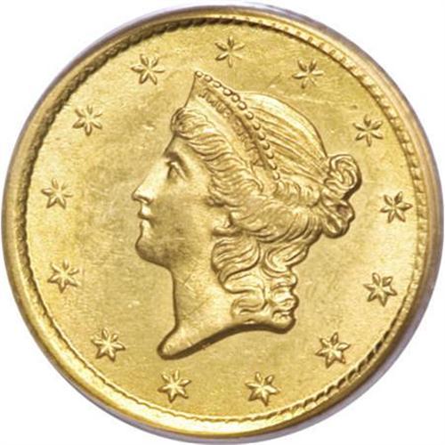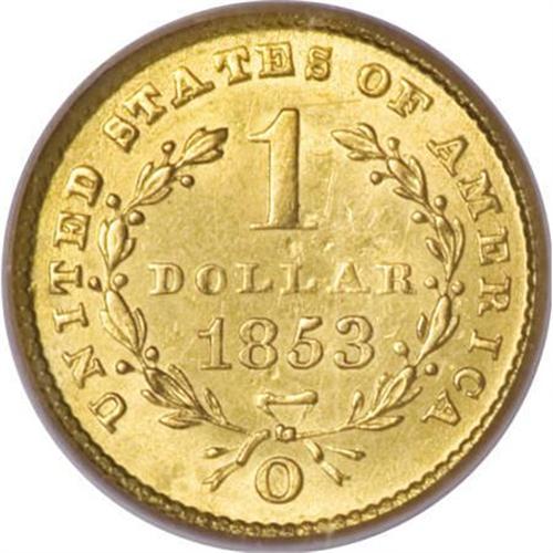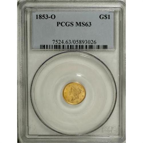 <B>1853-O G$1 MS63 PCGS.</B></I> Well struck with intense satiny radiance issuing forth from both sides, and pretty yellow-gold coloration that is undeniably attractive. A few wispy marks along the upper obverse, near the rim, prevent an even higher grade. According to Doug Winter (2006), the 1853-O is the best produced gold dollar from the New Orleans Mint. <BR><BR><B>Coin Engraver:</B> James B. Longacre<BR><BR><b>Shipping:</b> Coins & Currency (<a target="_blank" href="http://www.heritageauctions.com/common/shipping.php">view shipping information</a>)
