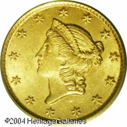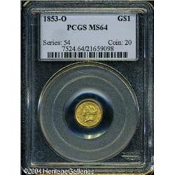 1853-O G$1 MS64 PCGS. The 1853-O is perhaps the mo <B>1853-O G$1 MS64 PCGS.</B></I> The 1853-O is perhaps the most common New Orleans Mint Gold Dollar, yet examples finer than this exquisitely preserved specimen are exponentially more expensive. Branch mint production often lacked the quality that the Philadelphia Mint was known for, yet this specimen is surely equal in every aspect to many Philadelphia mint issues. Sharply defined with green-golden surfaces, just a few minor marks limit this one from a Gem classification. Population: 13 in 64, 5 finer (10/04). <BR><BR><B>Important notice:</B> Heritage usually auctions material at the rate of 200-250 lots per hour. On some occasions eBay Live bid software or the Internet may not be able to keep up with the pace of the auction. We recommend placing a realistic absentee bid now as insurance to avoid disappointment. Occasionally the auctioneer may eliminate or reject an eBay Live bid, and the auctioneer may also reopen a lot after the close of the eBay live bidding (usually because we missed an audience bid), and may reject your bid even if it shows you as the winning bidder. By bidding via eBay Live, you agree that Heritage may award the lot to another bidder at its sole discretion under the circumstances described above or any other reasonable circumstances. Since eBay bids are not shown to us until we open the lot on the floor, we treat those bids just like floor bids. In most cases the floor responds before the eBay bid is presented to us, due to Internet lag time, so for consistency we have made it a policy that floor bids are always considered first over tie eBay live bids. Also please note that all Heritage lots purchased through eBay Live carry a 20% Buyer's Premium. Please make sure you read the Terms and Conditions before you bid. This lot is being auctioned in conjunction with a live floor auction by Heritage Galleries & Auctioneers. All final auction and invoice information will be supplied by Heritage Galleries & Auctioneers, and all other information should be considered preliminary. Lot:6437