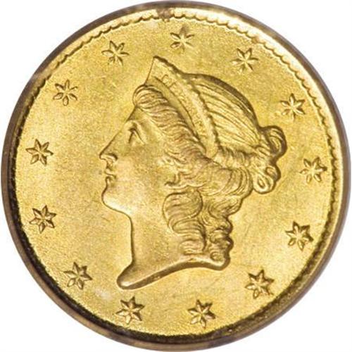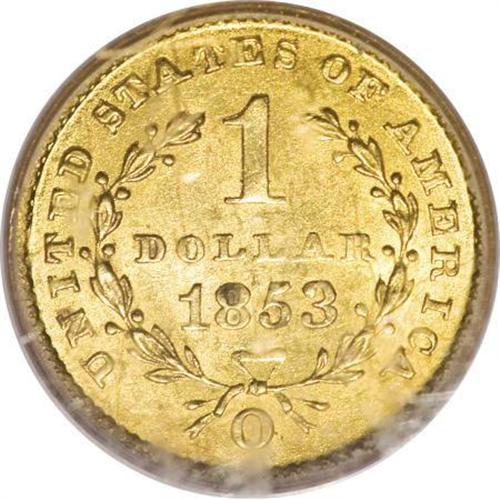 <B>1853-O G$1 MS64 PCGS.</B></I> An ideal date for the type collector who seeks an example from New Orleans, this issue had a mintage of 290,000 coins and a high survival rate as well. However, examples that approach Gem grades are elusive, as the population data suggests. A sharply struck piece, this dollar has frosty orange-gold luster with a few splashes of darker toning. Population: 23 in 64, 6 finer (8/07).<BR><BR><B>Coin Engraver:</B> James B. Longacre<BR><BR><b>Shipping:</b> Coins & Currency (<a target="_blank" href="http://www.heritageauctions.com/common/shipping.php">view shipping information</a>)