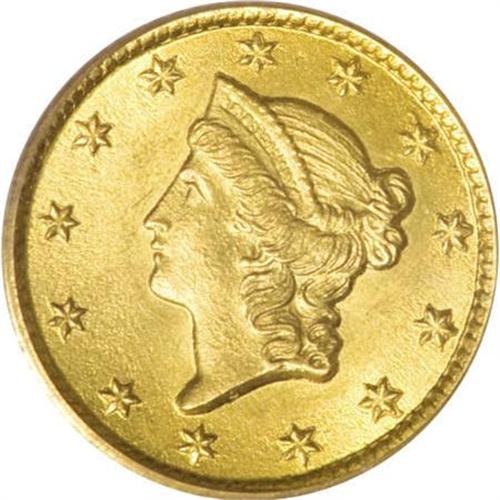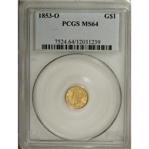 <B>1853-O G$1 MS64 PCGS.</B></I> Gem 1853-O gold dollars are legitimately rare. The current coin affords one the opportunity to acquire a near-Gem example with the eye appeal of a coin grading higher. A pleasantly strong strike, orange-gold coloration and rich, satiny luster defines this attractive piece. Population: 24 in 64, 6 finer (12/07).<BR><BR><B>Coin Engraver:</B> James B. Longacre<BR><BR><b>Shipping:</b> Coins & Currency (<a target="_blank" href="http://www.heritageauctions.com/common/shipping.php">view shipping information</a>)