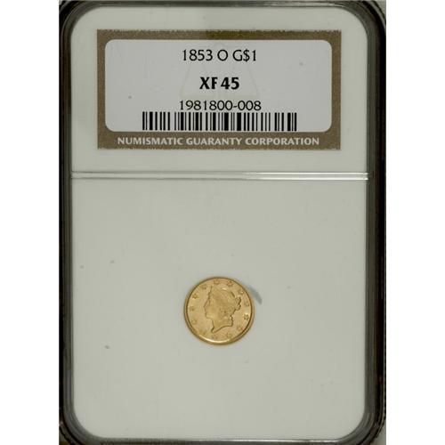 <B>1853-O G$1 XF45 NGC.</B></I> NGC Census: (7/862). PCGS Population (9/397). Mintage: 290,000. Numismedia Wsl. Price for NGC/PCGS coin in XF45: $189. (#7524)<BR><BR><b>Shipping:</b> Coins & Currency (<a target="_blank" href="http://www.heritageauctions.com/common/shipping.php">view shipping information</a>)