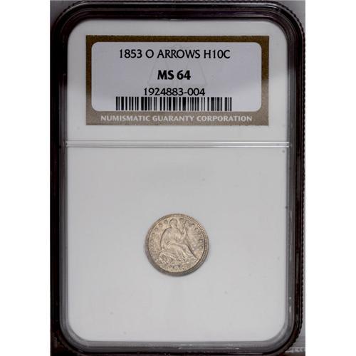 <B>1853-O<H10C> Arrows MS64 NGC.</B></I> Whispers of lilac and gold-tan patina adhere to lustrous surfaces. Sharply struck design features prevail]ail. A tiny mark is seen beneath liberty's right breast. Census: 13 in 64, 6 finer (1/06).
