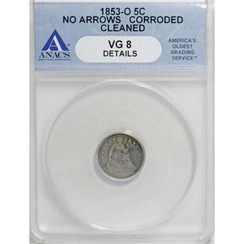 <B>1853-O H10C No Arrows--Cleaned, Corroded--ANACS .VG8 Details.</B></I> NGC Census: (0/21). PCGS Population (0/29). Mintage: 160,000. Numismedia Wsl. Price for NGC/PCGS coin in VG8 : $210. (#4352)<BR><BR><B>Coin Engraver:</B> Christian Gobrecht<BR><BR><b>Shipping:</b> Coins & Currency (<a target="_blank" href="http://www.heritageauctions.com/common/shipping.php">view shipping information</a>)