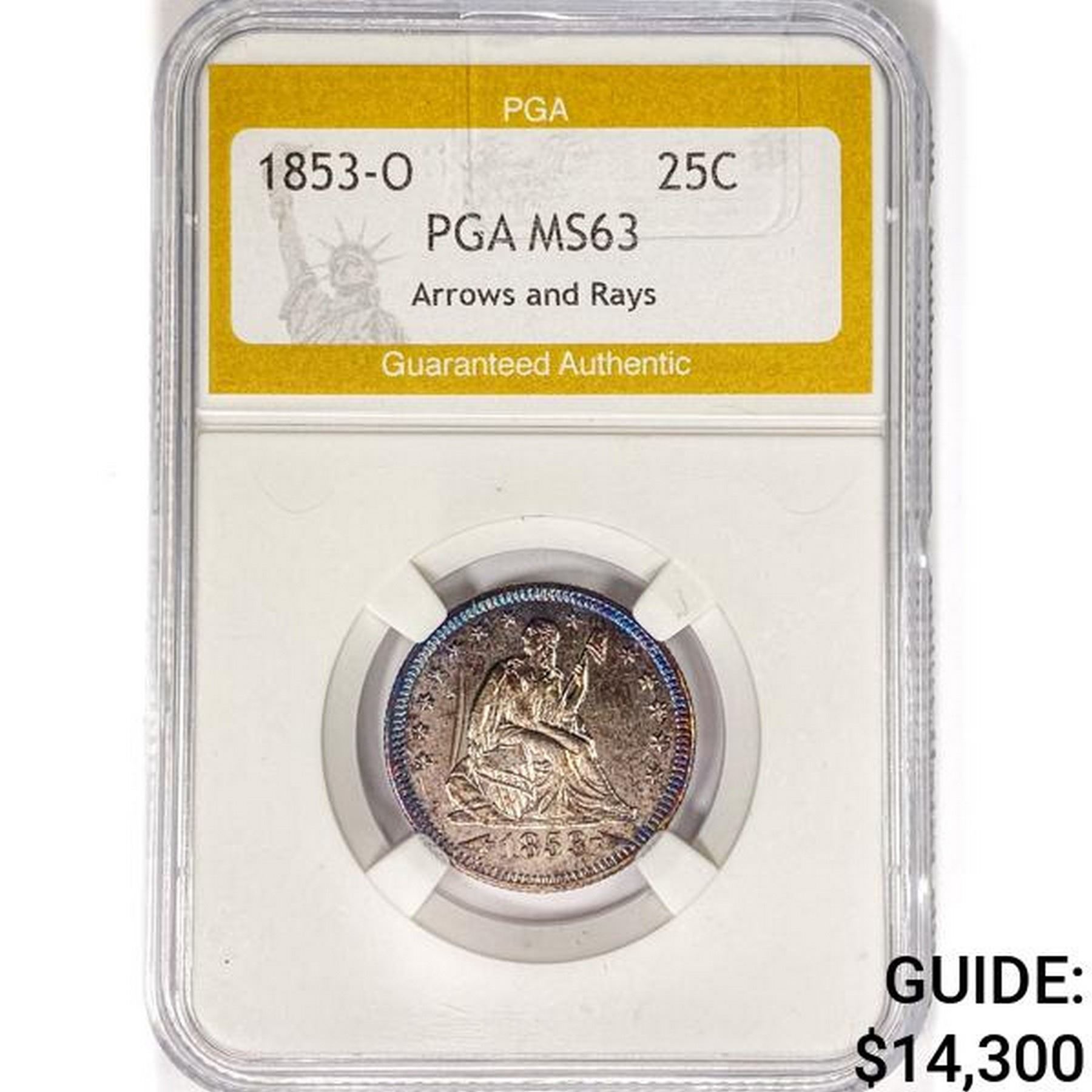 1853-O Seated Lib. 25C PGA MS63 Arrows & Rays