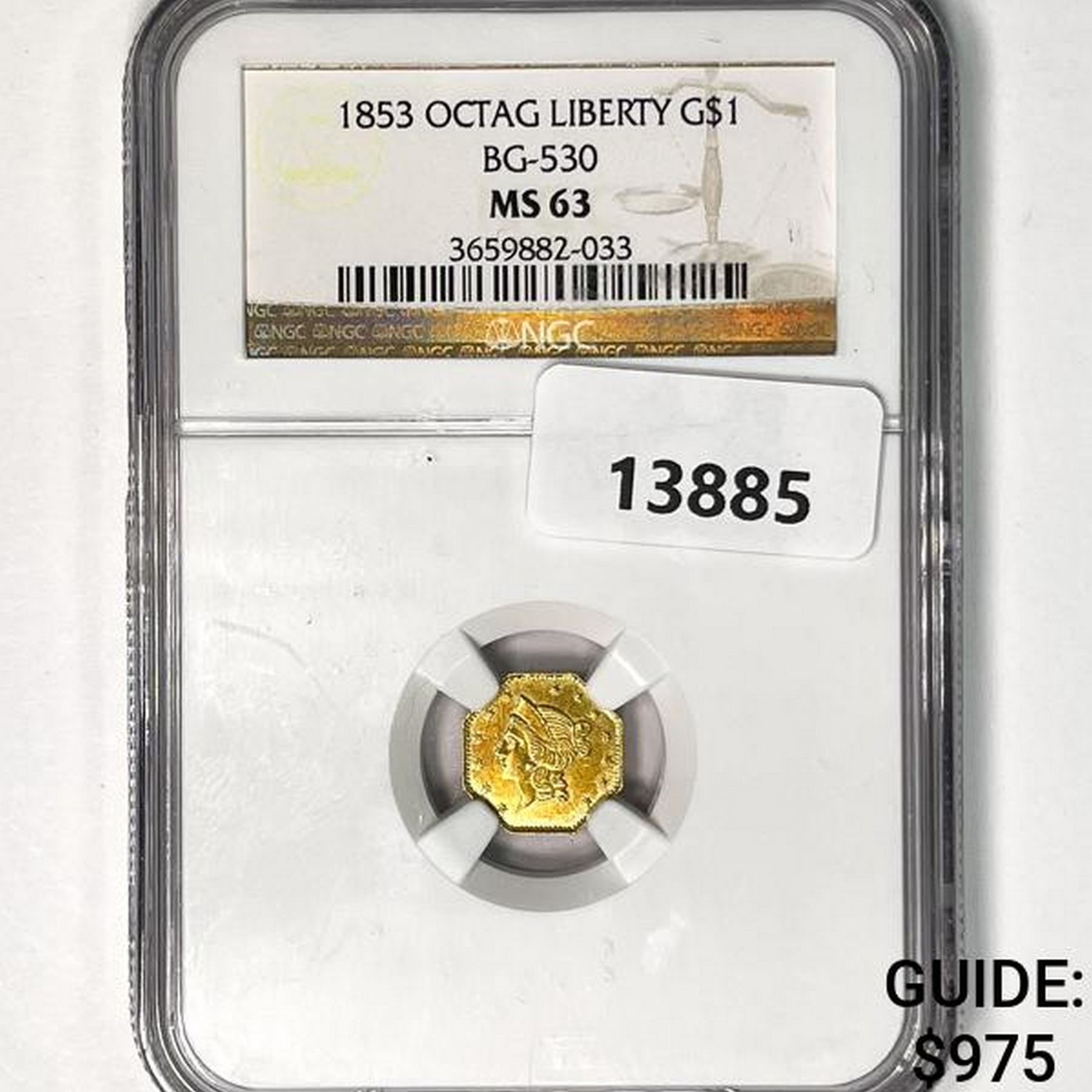 1853 Octagonal Liberty Rare Gold Dollar NGC - MS63