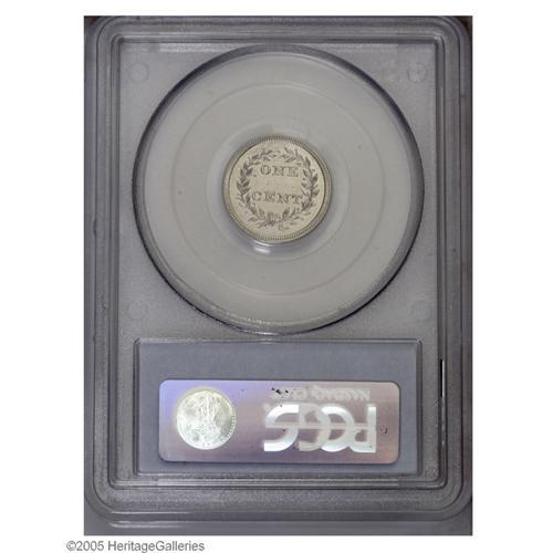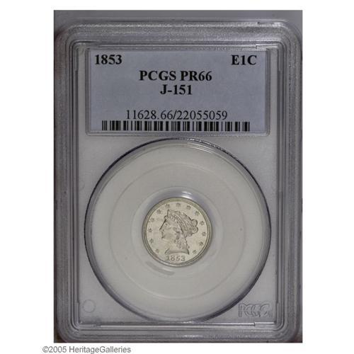 <B>1853<P1C> One Cent, Judd-151, Pollock-178, Low R.6, PR66 PCGS.</B></I> The obverse is the same as that used to coin regular issue 1853 quarter eagles. The reverse shows the denomination ONE CENT within a laurel wreath. Struck in a 40% nickel, 60% copper alloy with a reeded edge. Fully struck, the surfaces are bright and undimmed by the passage of 152 years. The fields are deeply mirrored and there are no mentionable pedigree identifiers on either side.