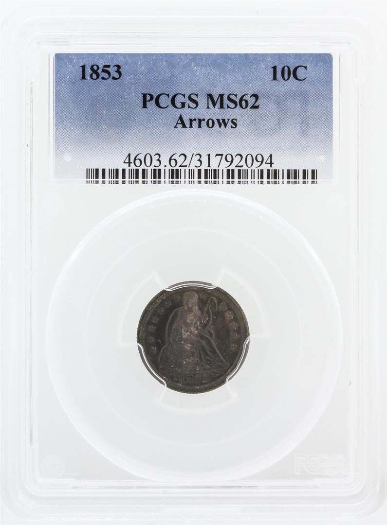 One 1853 PCGS MS62 10 Cent Arrows Coin. PCGS Certified.