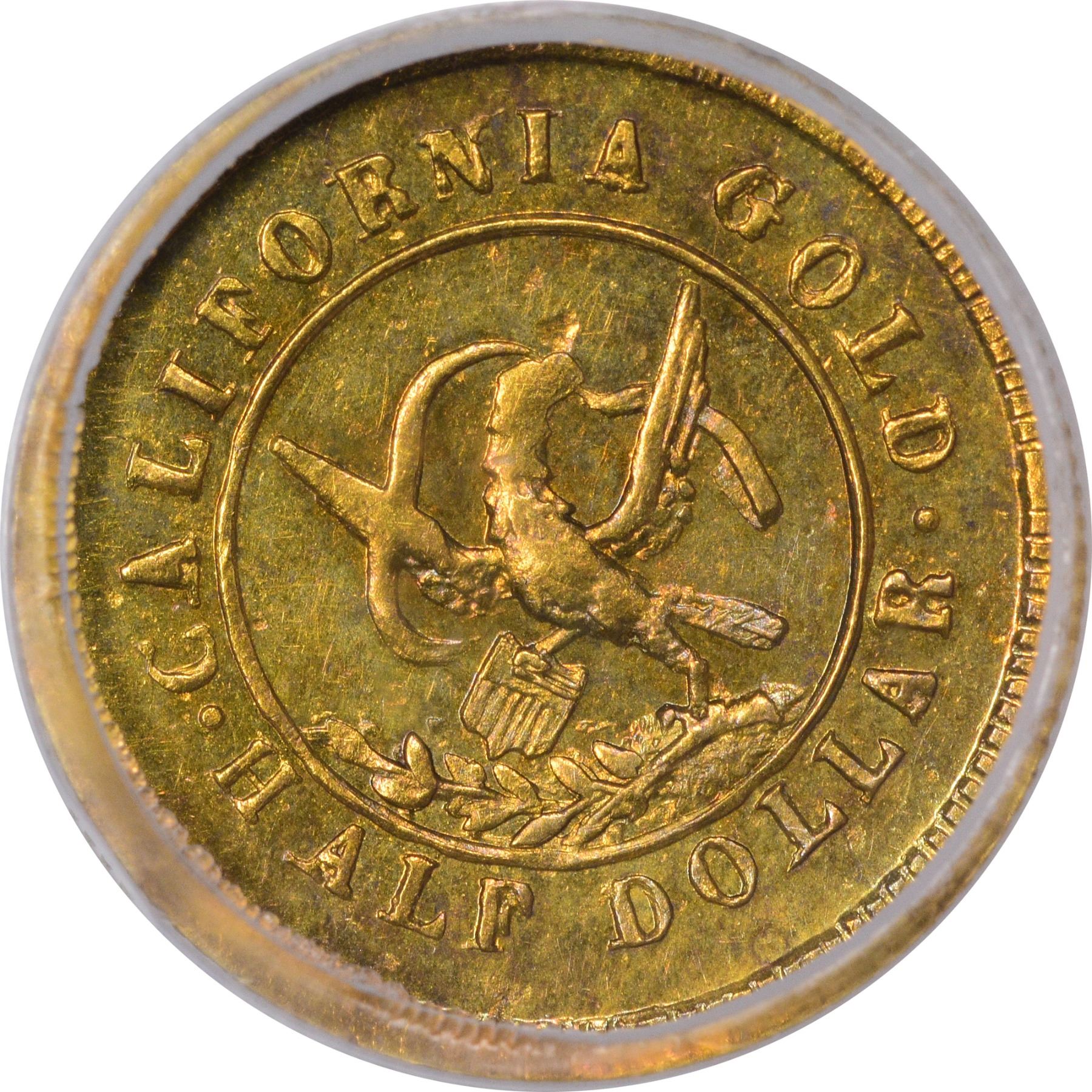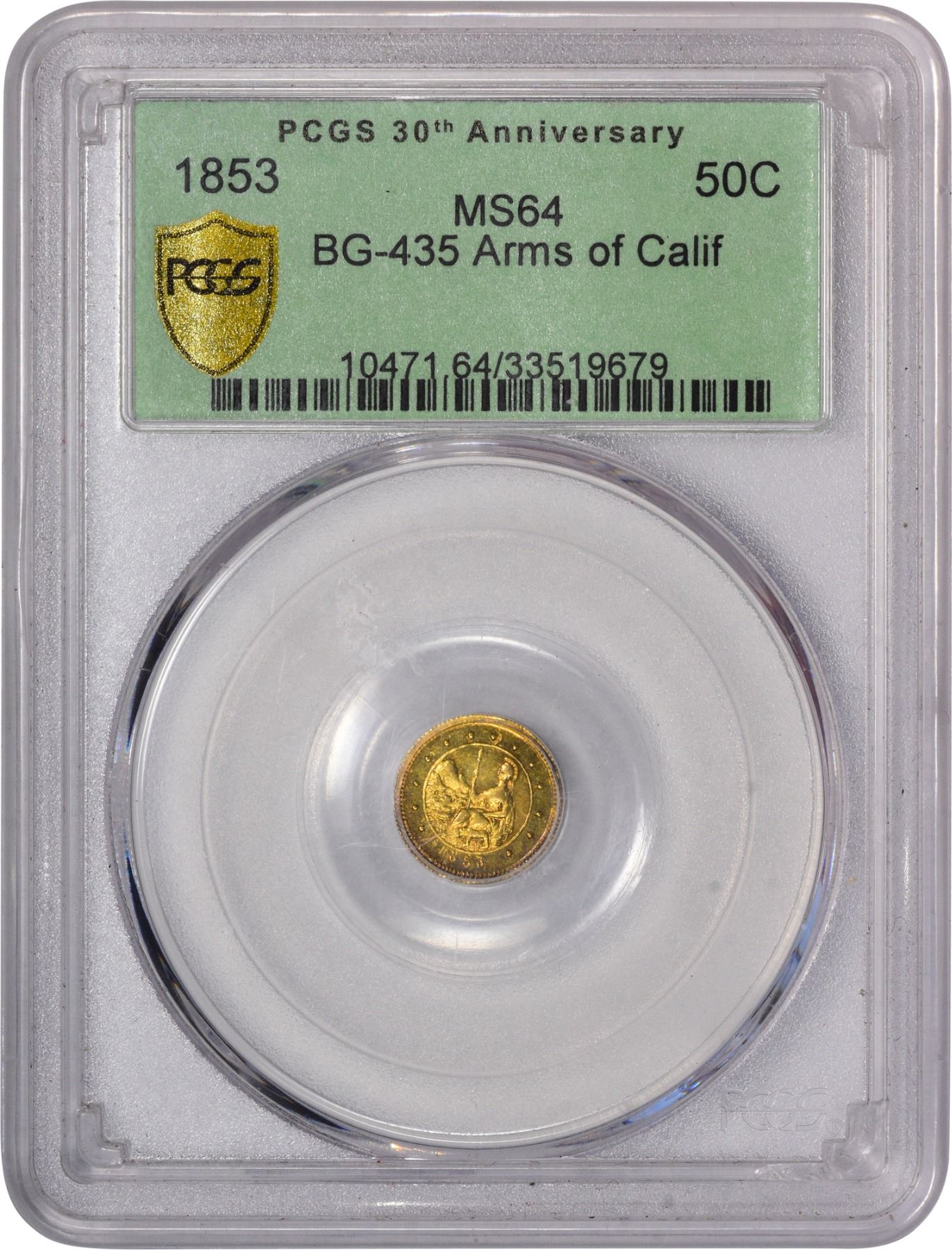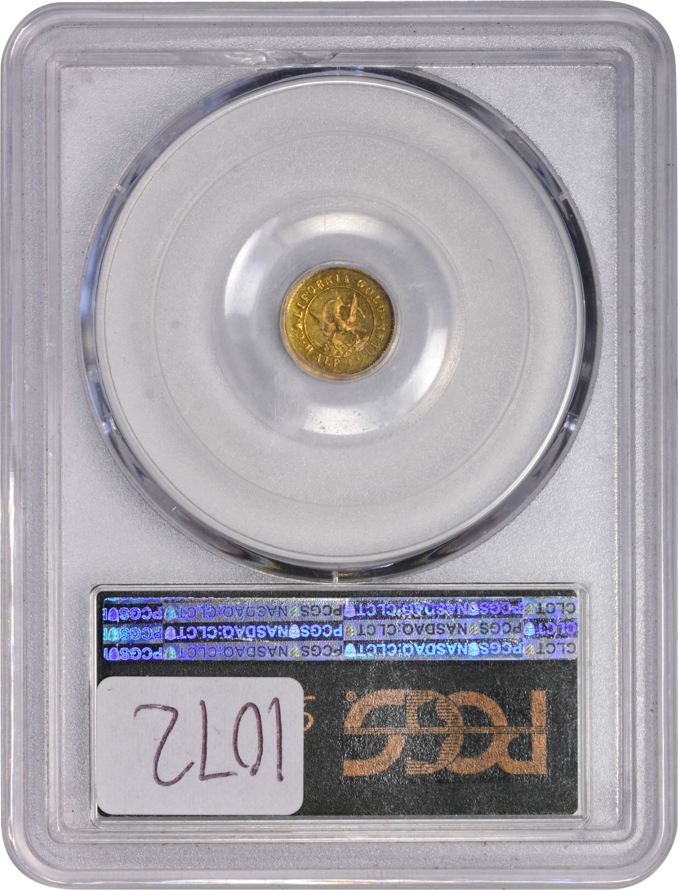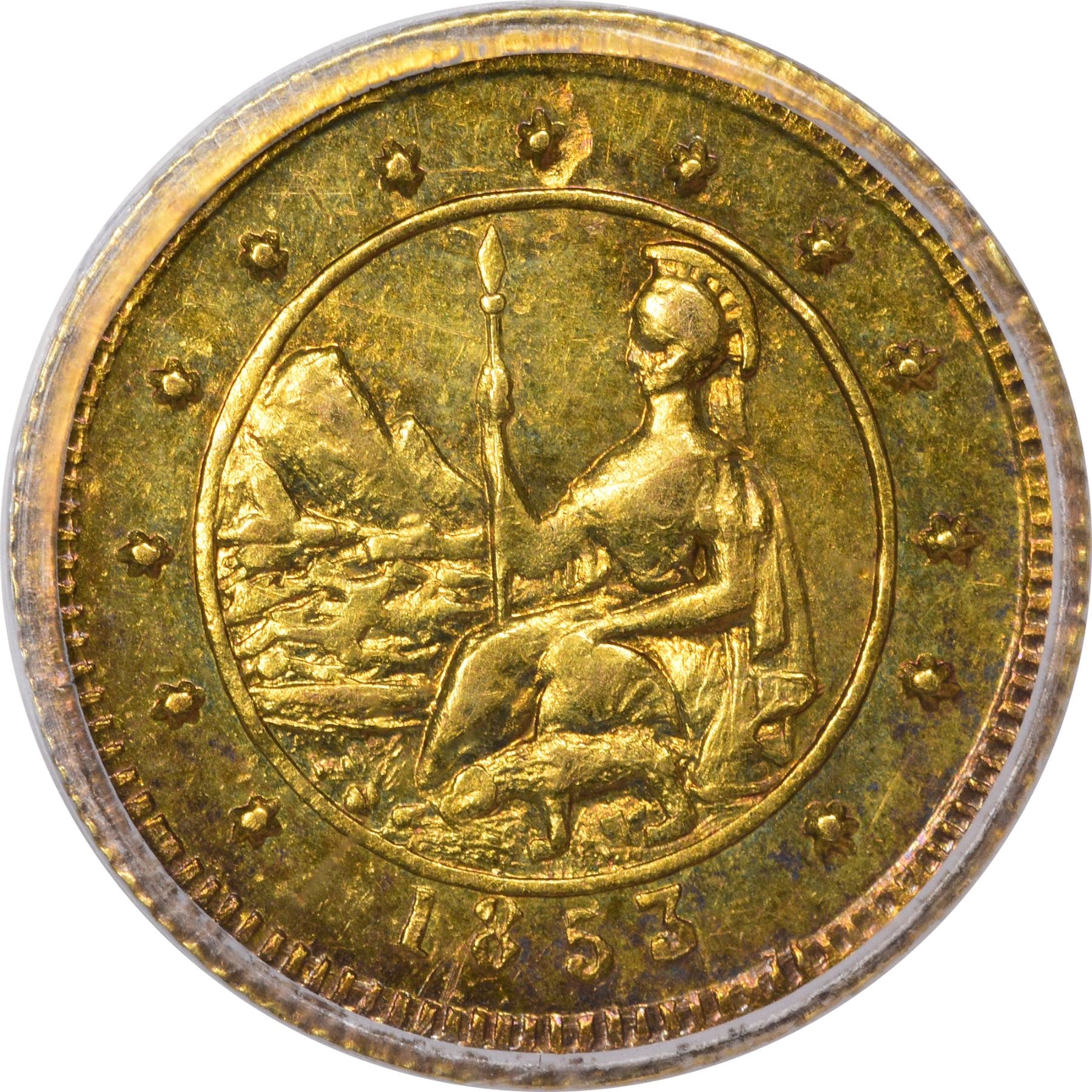 This lustrous honey-gold example is alive with varied orange and rose iridescence, especially in a bold light source. Though called Low Rarity-5 historically, the demand for the type, unique to the series, makes the rarity factor seem somewhat higher, especially for high-quality pieces. Fewer than a half dozen examples of this popular issue have been certified finer than the present piece by PCGS. Housed in an old-style green label PCGS holder with plastic frame. Period One. Unknown Maker, perhaps Braverman & Levy.