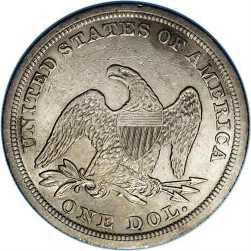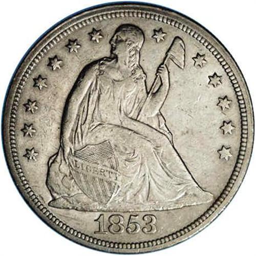 <B>1853<S$1> AU55 NGC.</B></I> An original example with pleasing surfaces and traces of wear on the highest points and in the fields. Light silver-gray patina graces each side, and a few scattered abrasions are present. Uncleaned Seated Dollars are difficult to locate in high circulated grades.